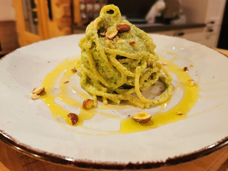 Spaghetti mit Brokkolicreme und Haselnüssen