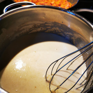 Die restliche Milch zugeben, alles auf- und leicht einköcheln lassen. Die Béchamel sollte relativ dick sein.