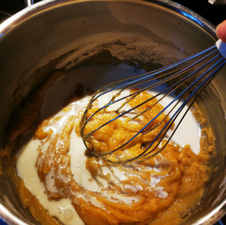 Nun mit der Hand die Schalenreste abziehen und den Kürbis zur Béchamel geben und mit dem Pürierstab pürieren. Bei Bedarf nochmals mit Salz abschmecken.