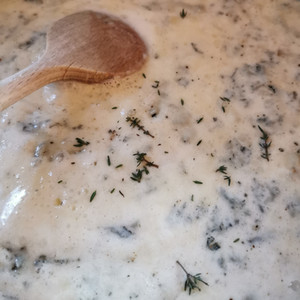 Etwas Pfeffer und frischen Thymian zugeben und die Herdplatte abschalten, sobald sich der Käse aufgelöst hat.