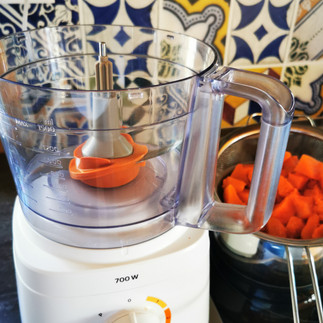 Den Kürbis schälen, in Würfel schneiden und in einem Topf mit einem ganz kleinen Schluck Wasser – zugedeckt – schön weichkochen. Einen Zweig Rosmarin und 1 TL grobes Salz auch gleich zugeben.