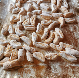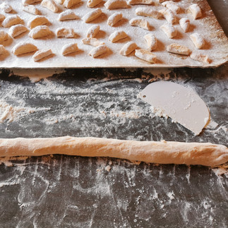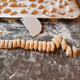 Den Gnocchi Teig nun in 6-8 Teile schneiden, jeden Teil zu einer länglichen ca. 2 cm dicken Wurst rollen und Gnocchi abstecken.