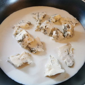Den Gorgonzola entrinden und in Würfel schneiden/brechen. Zusammen mit der Milch in einer großen Stielpfanne langsam erwärmen.
