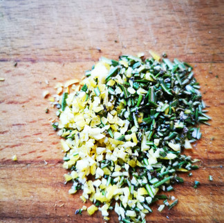 Rosmarinnadeln und die Schale einer Zitrone möglichst fein schneiden.