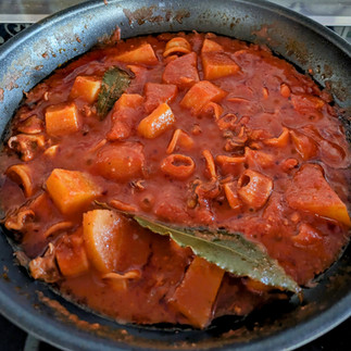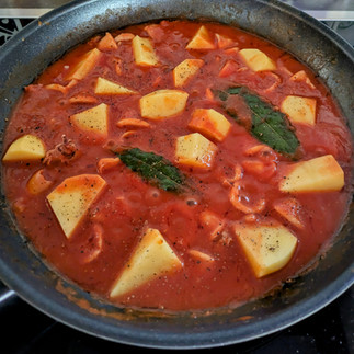 Geschmorter Tintenfisch in würzigem Sugo mit Erdäpfeln. Klassischerweise wird dieses Rezept an der oberen Adria gerne mit Polenta serviert. Aber auch die direkt in der Pfanne mitgeschmurgelten Erdäpfel passen perfekt dazu.