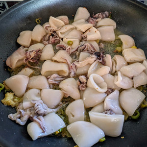 Inzwischen die Tintenfische in Stücke schneiden, kleine Exemplare halbieren, größere dritteln und ebenfalls zugeben. Circa 5 Minuten weiterbraten und mit dem Weißwein ablöschen.